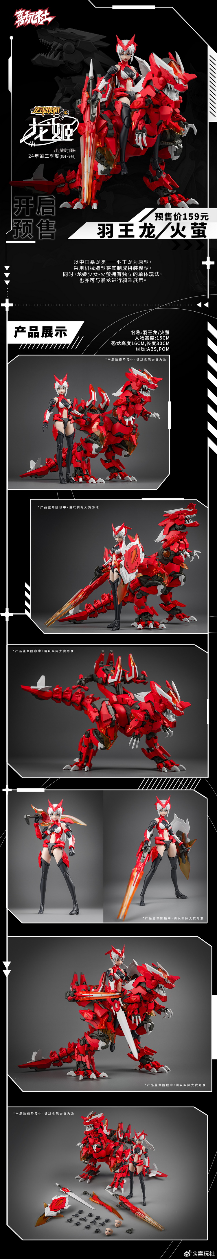 本款产品以中国暴龙类——羽王龙为原型,采用机械造型将其制成拼装模型。同时,龙姬少女拥有独立的单体玩法,也亦可与暴龙进行骑乘展示。