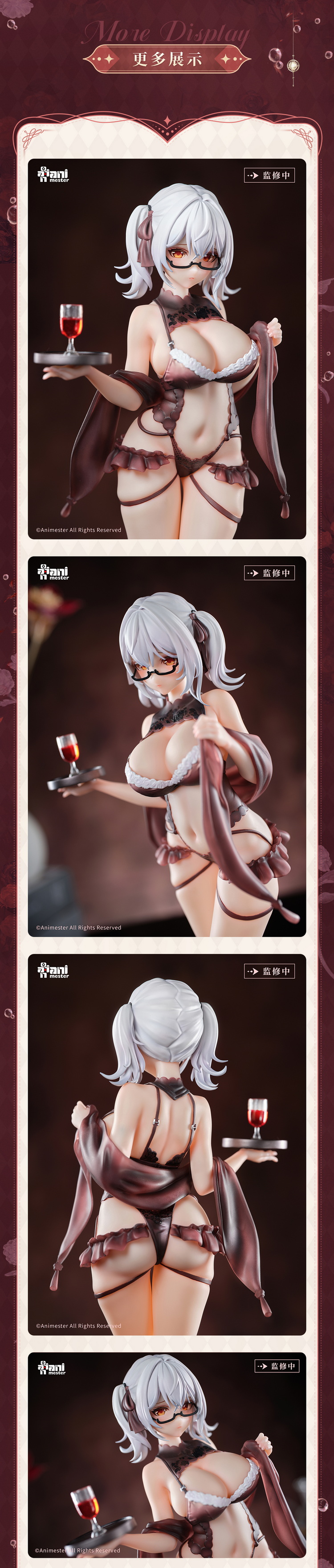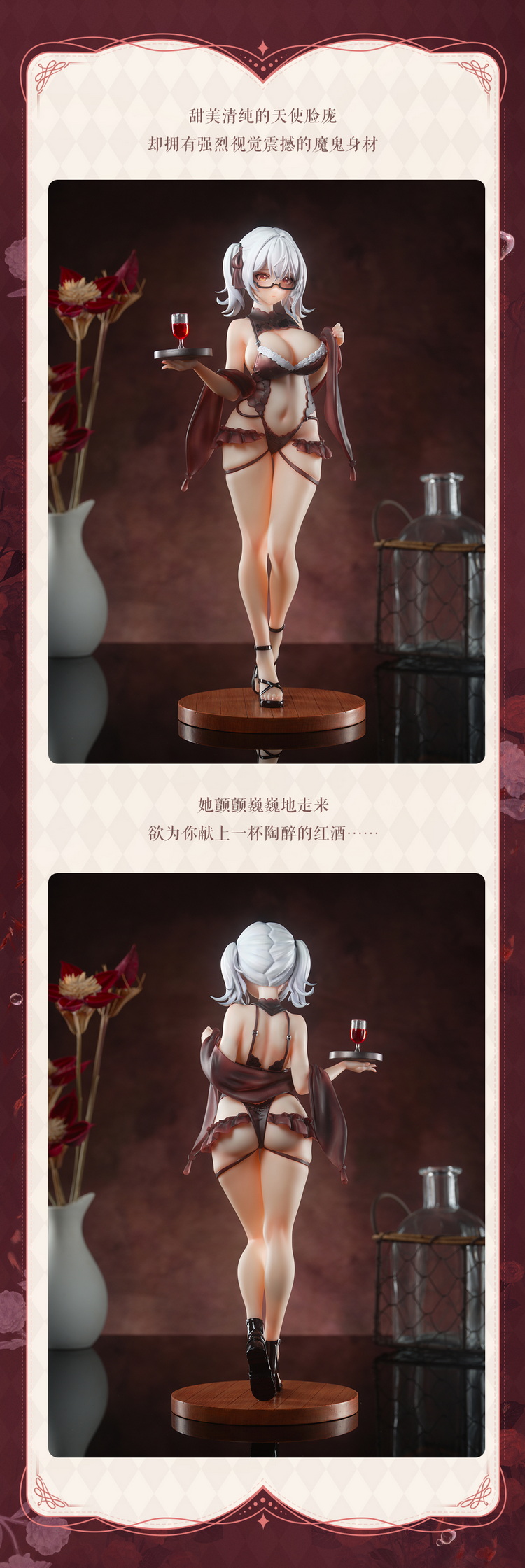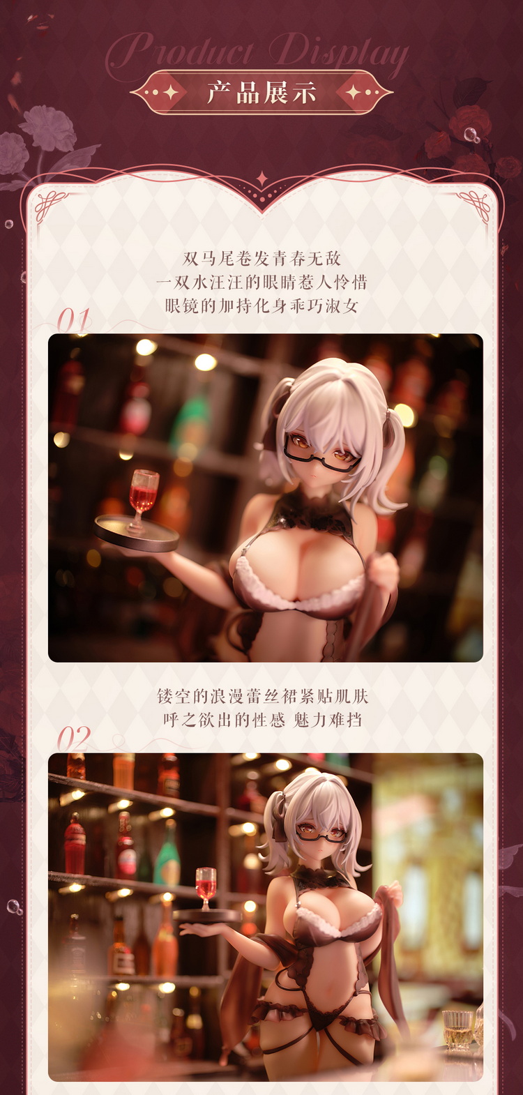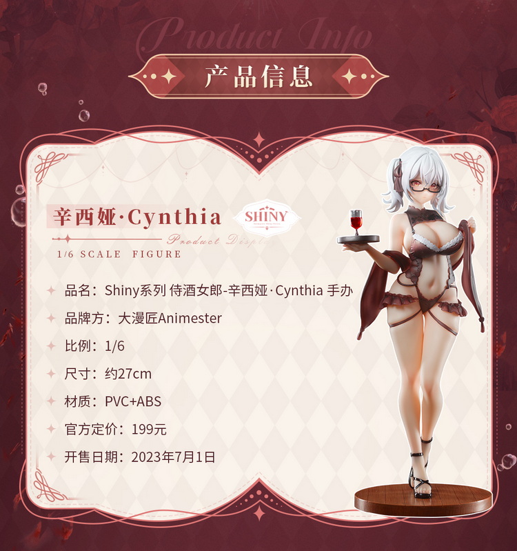 手办造型定格在辛西娅·Cynthia与你对视的瞬间,她眸光温柔,神色俏丽。一身大胆的镂空蕾丝裙在夜色的笼罩下显得尤为娇艳,视觉张力直接拉满。她右手扶着托盘,欲为你献上一杯陶醉的红酒……
