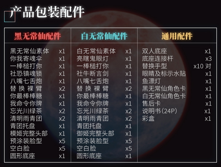 份权限卡 X1,白无常仙身份权限卡 X1,售后卡 X1,说明书 X1(24P),彩盒 X1