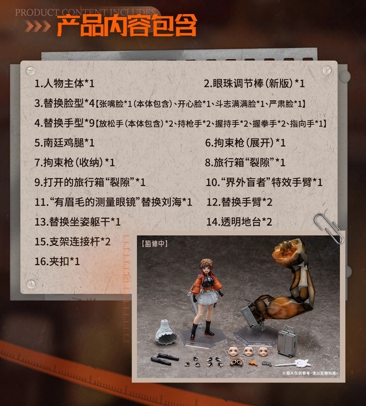 Also comes with numerous replacement parts such as alternate bangs, alternate arms, alternate restraint guns, alternate seated torso, open travel case... These can be used to recreate Akio wearing glasses, Akio without her jacket, seated Akio, and skill-casting Akio. More ways to play await your discovery!
