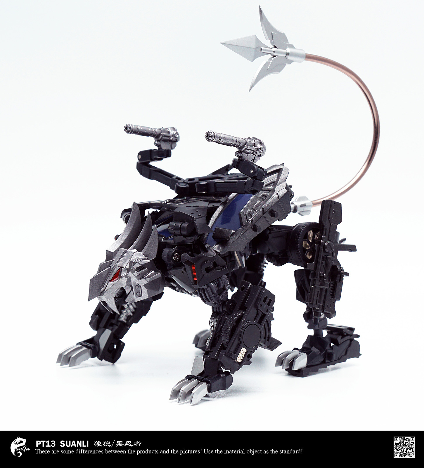 【盘古模型出品】PT12三变战士狻猊 · 黑忍者开始预售! ! !本品为涂装完成品,身高约13cm,超可动设计,可变化为跑车形态,神兽狻猊形态以及忍者形态,配件丰富,更换武器装备可变换不同造型!!!