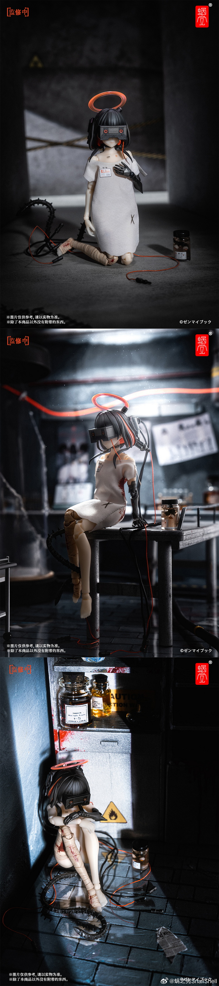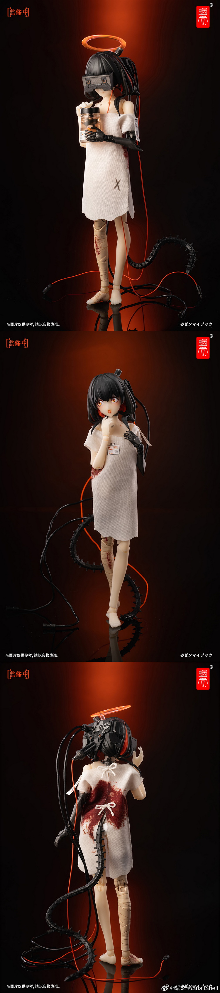 独特造型:为还原设定中改造实验的少女身躯,三款产品的素体细节各不相同,除造型设计不同外,涂装细节也是各不相同。