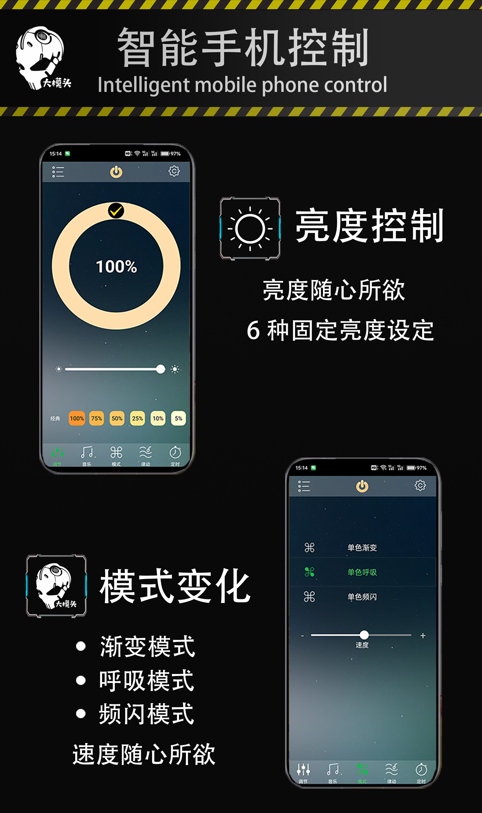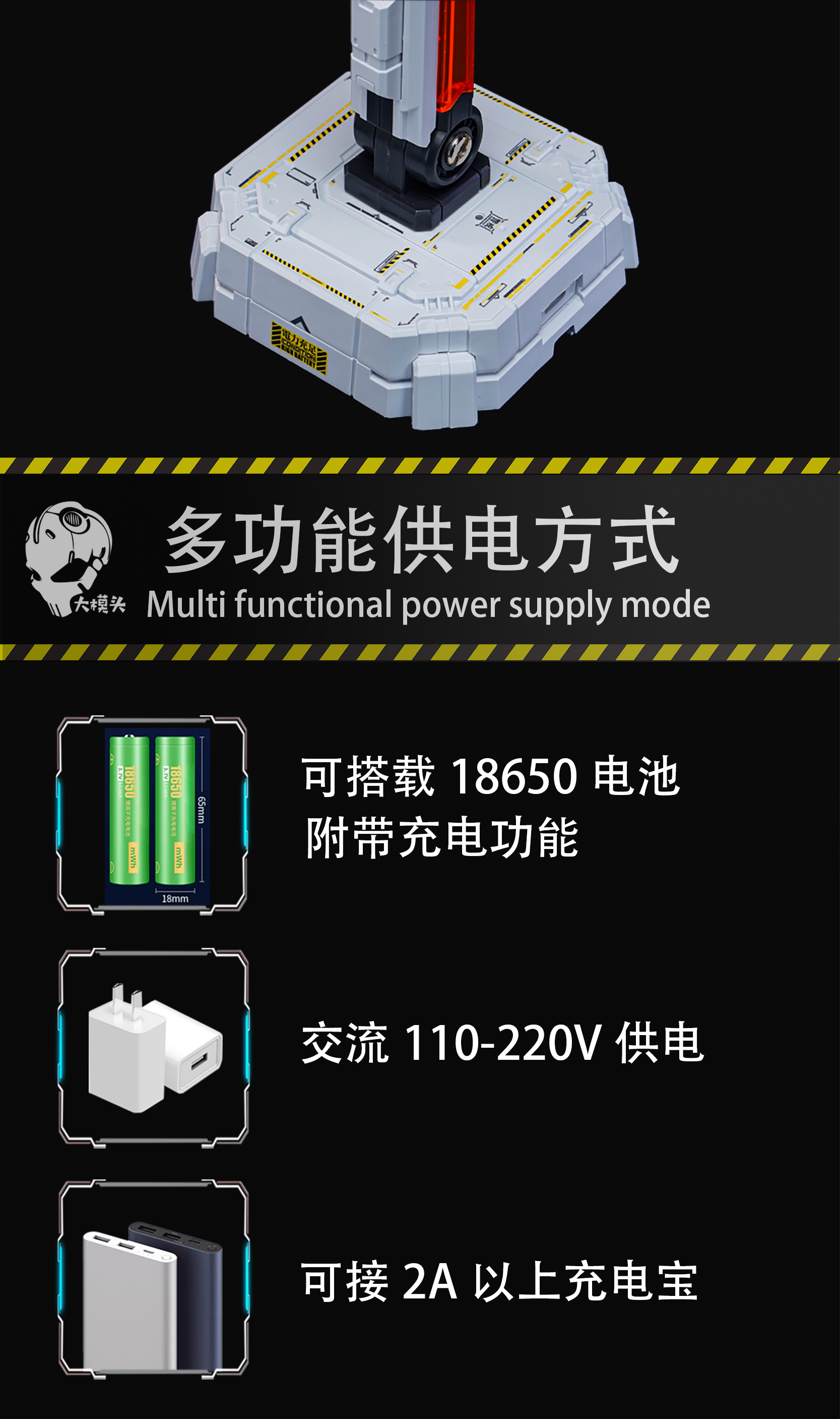 功能:触摸控制,多档光亮度调节,多档快慢呼吸模式,多档快慢闪电模式,可搭截18650电池使用