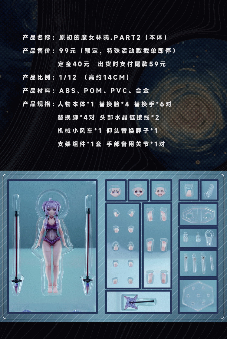Main figure *1, replacement faces *4, replacement hands *6 pairs, replacement feet *4 pairs, head crystal connection wires *2,