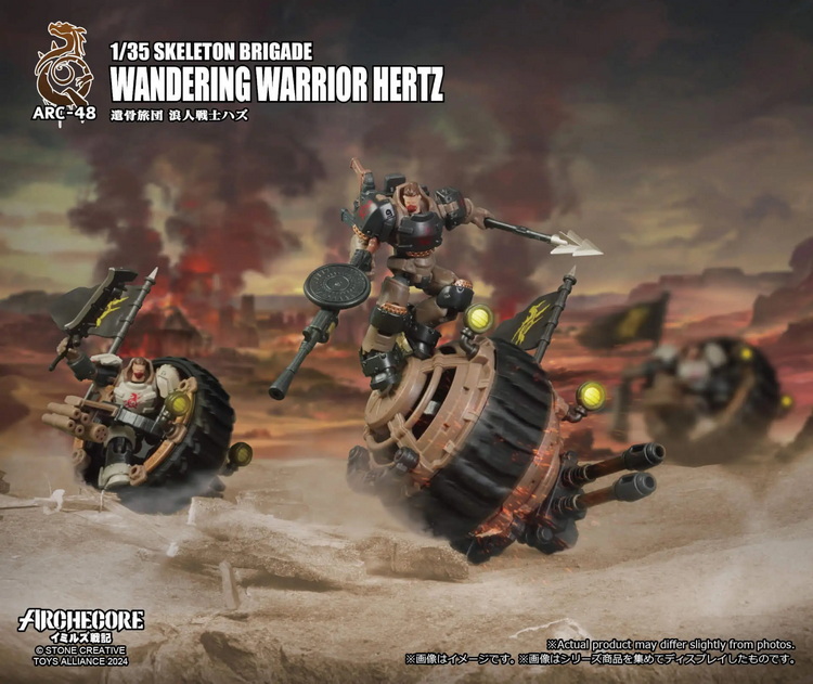 Hertz was once a Veck warrior, tasked with defending the royal city. However, after offending a noble and losing his wife and daughter, he wandered into foreign lands. Still wearing his Veck Arche Armor, he found himself in the lawless wastelands. His obsessive hatred led him to become a bounty hunter who seeks vengeance for others, and a rare enforcer of the law (a paid one, enforcing laws of his own making) in the Wasteland and the Sand Sea. By raiding Karsten forces, he acquired arms. Soon, a number of his former Veck comrades, disgraced Karsten Knights, and Lanns joined his group. Using the stolen Karsten prototype and blueprints, he asked the Desert Reptilis workshops to craft the Chakram Bike. His unorthodox behavior caused tension with the tribes, but he eventually struck a deal with Mosa, the leader of the Hot Sand Brigade . In exchange for resources, Hertz and his companions would search for Arche ruins on Mosa’s behalf. Thus, the “Skeleton Brigade” was born. Since the Chakram Bikes are difficult to control, its drivers must wear Arche Armor to augment their strength. Given the lack of Arche Armor in the Desert Reptilis tribes and the limited number of bikes produced, the bikes are only for the strongest members of the Skeleton Brigade.