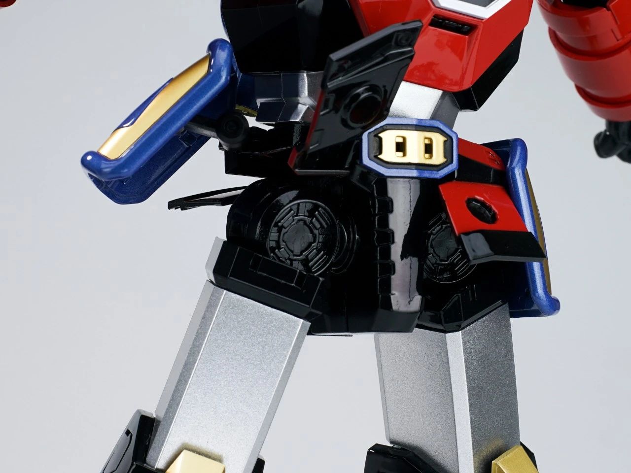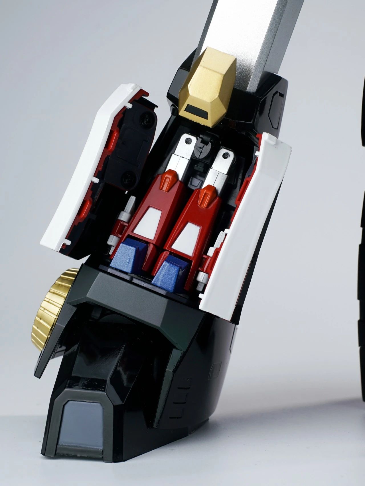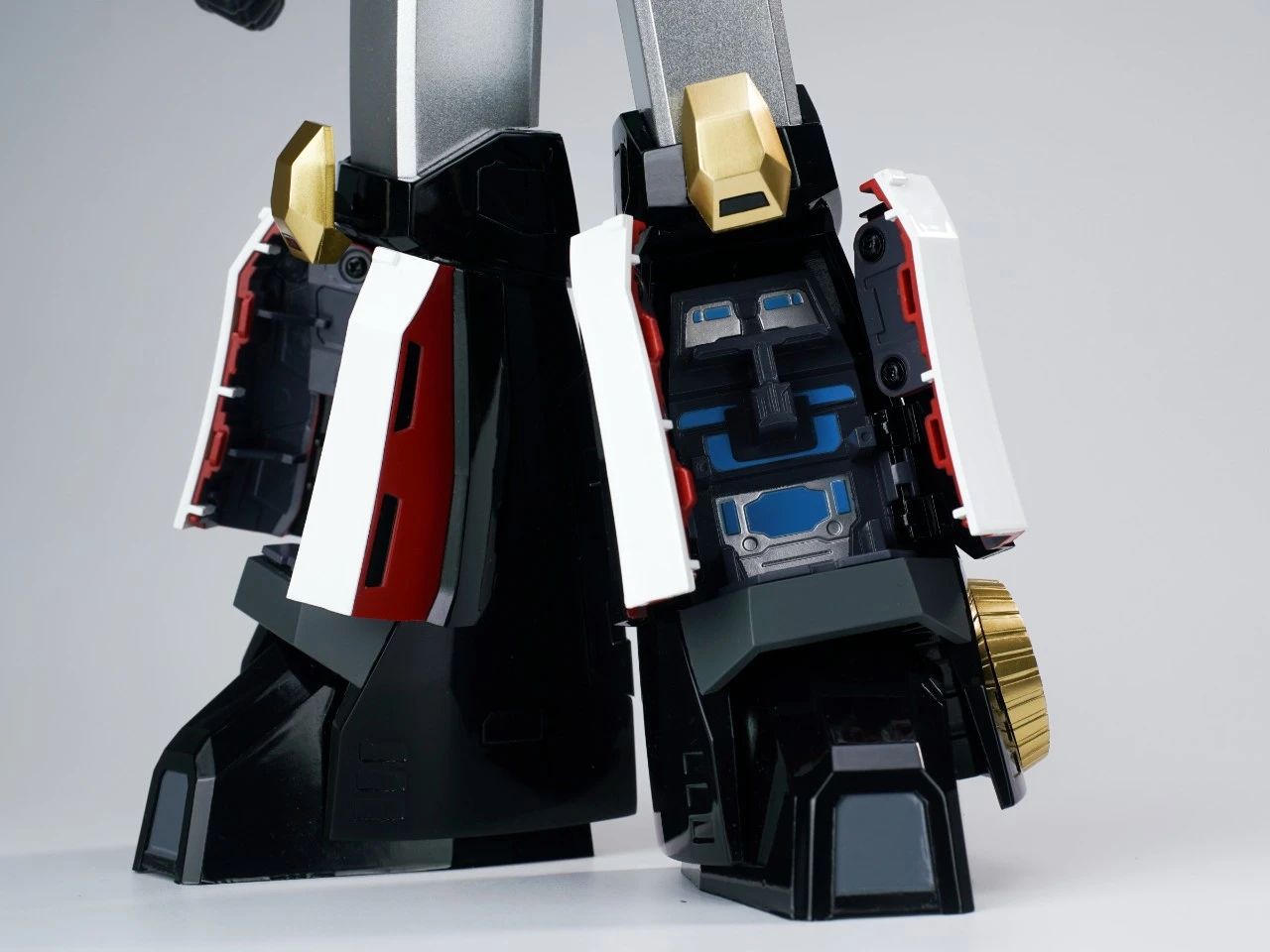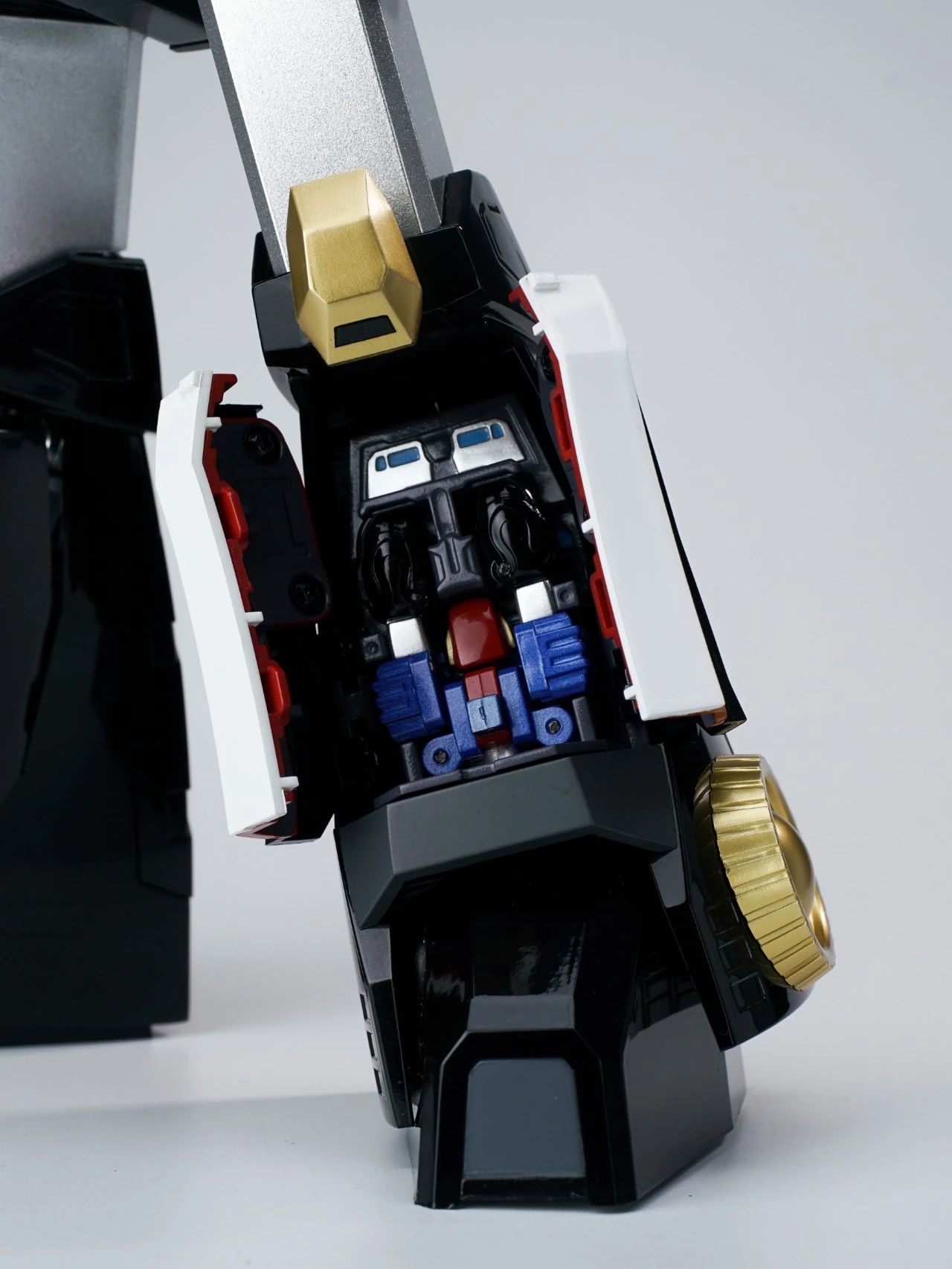 本体的躯干和双腿分别有针对收纳三台战斗机的专用收纳舱,内部细节还有分色涂装来呈现,个人认为这一款是非常适合摆出合体瞬间的状态。▼