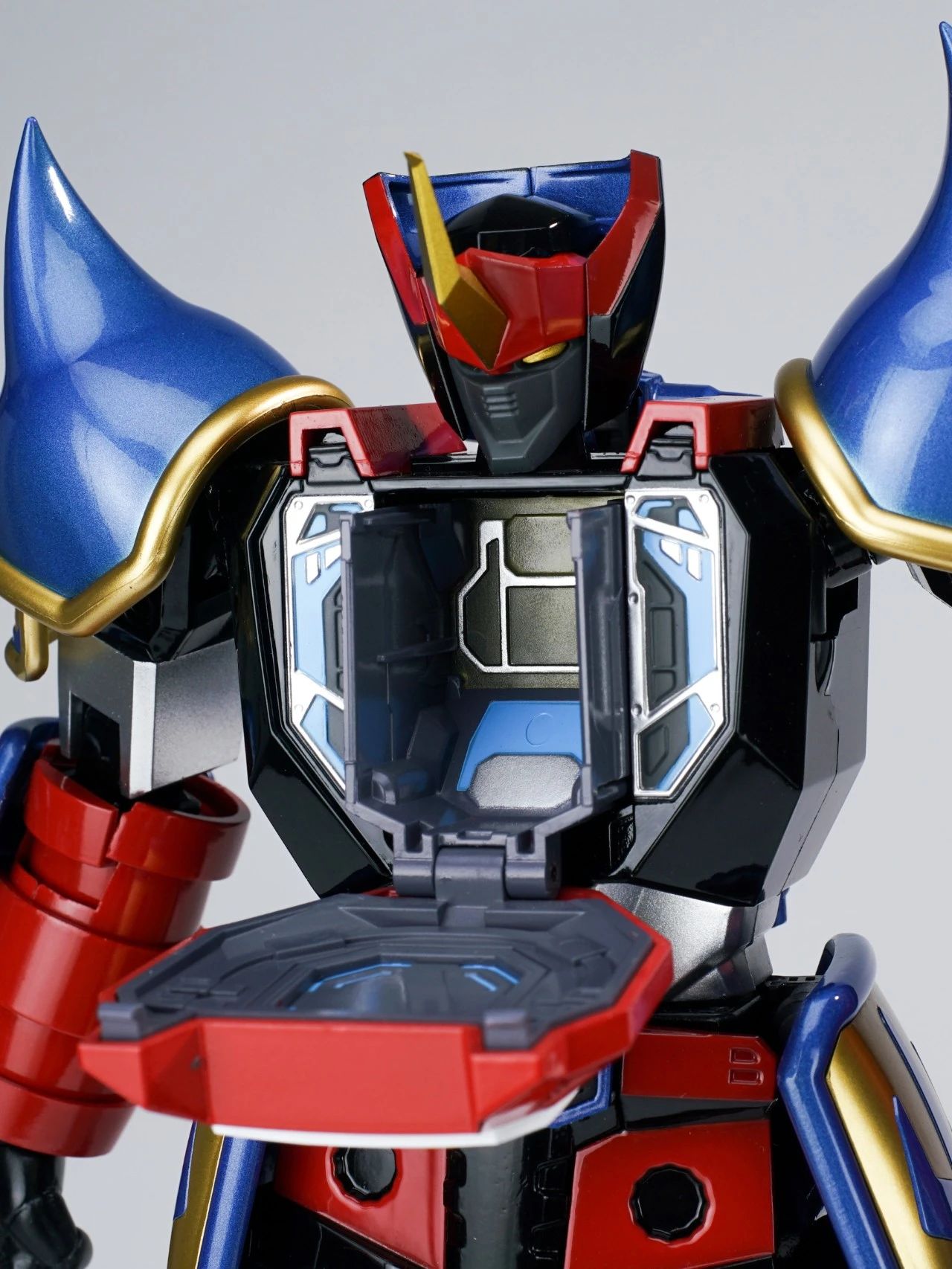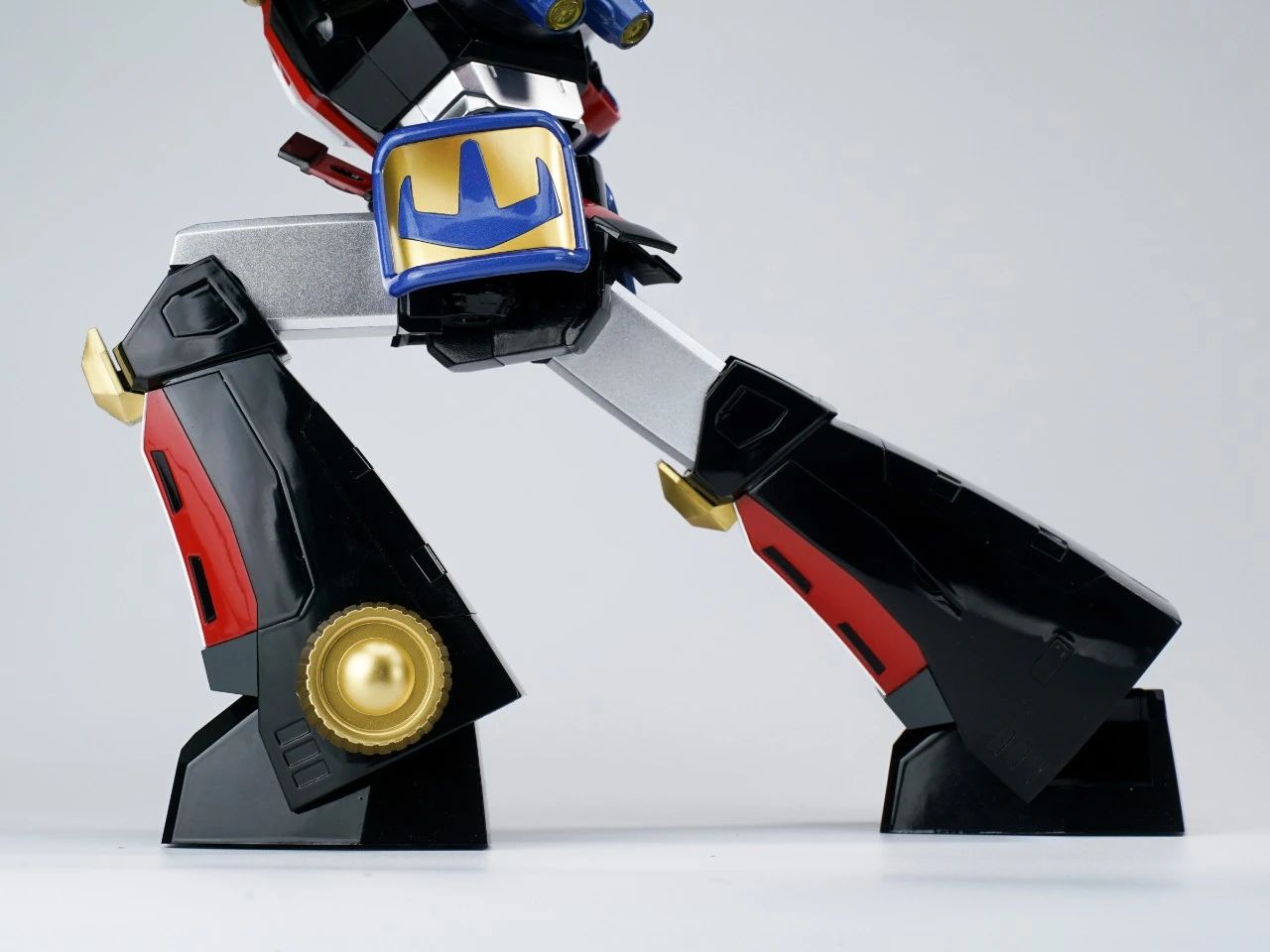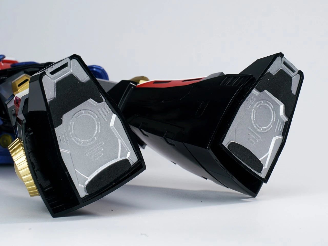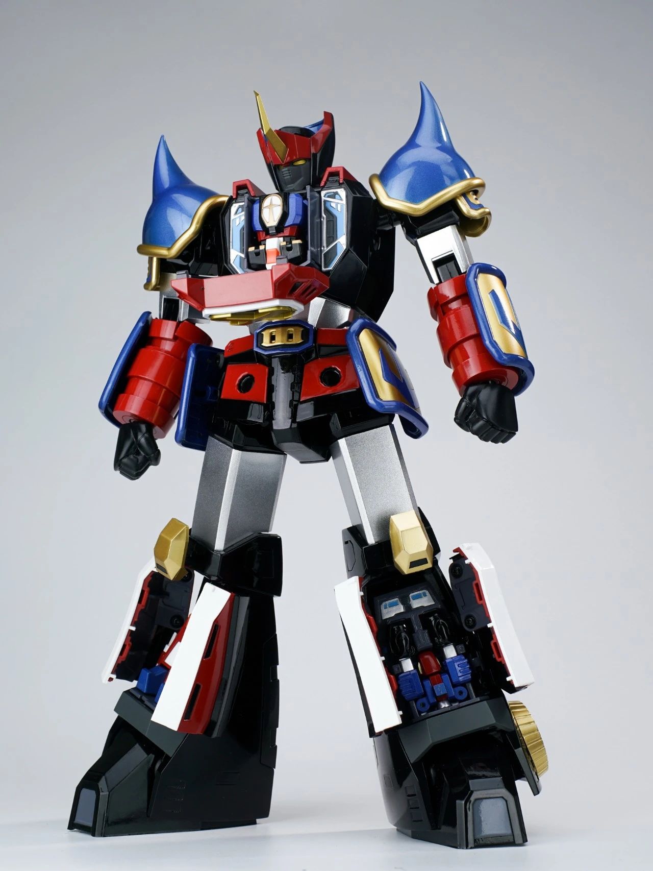 本体的躯干和双腿分别有针对收纳三台战斗机的专用收纳舱,内部细节还有分色涂装来呈现,个人认为这一款是非常适合摆出合体瞬间的状态。▼