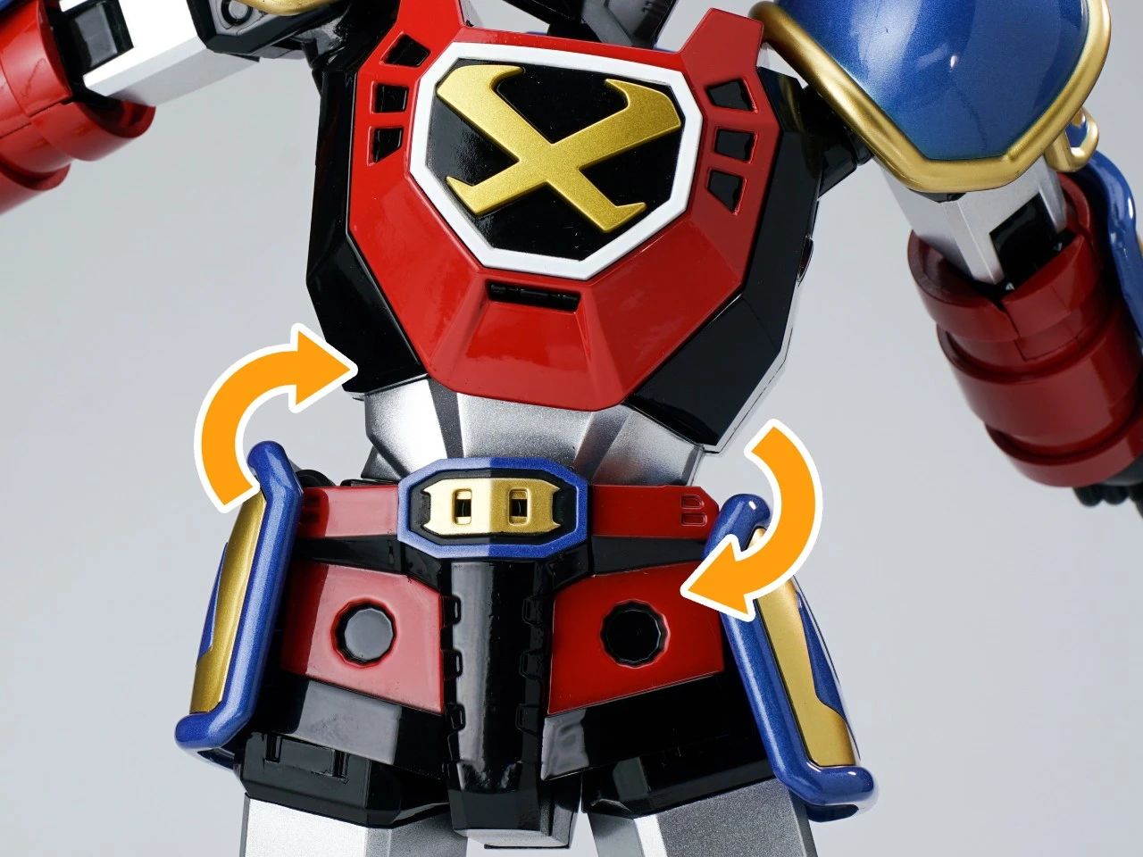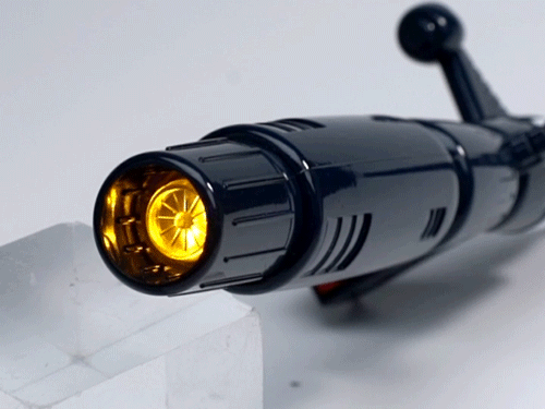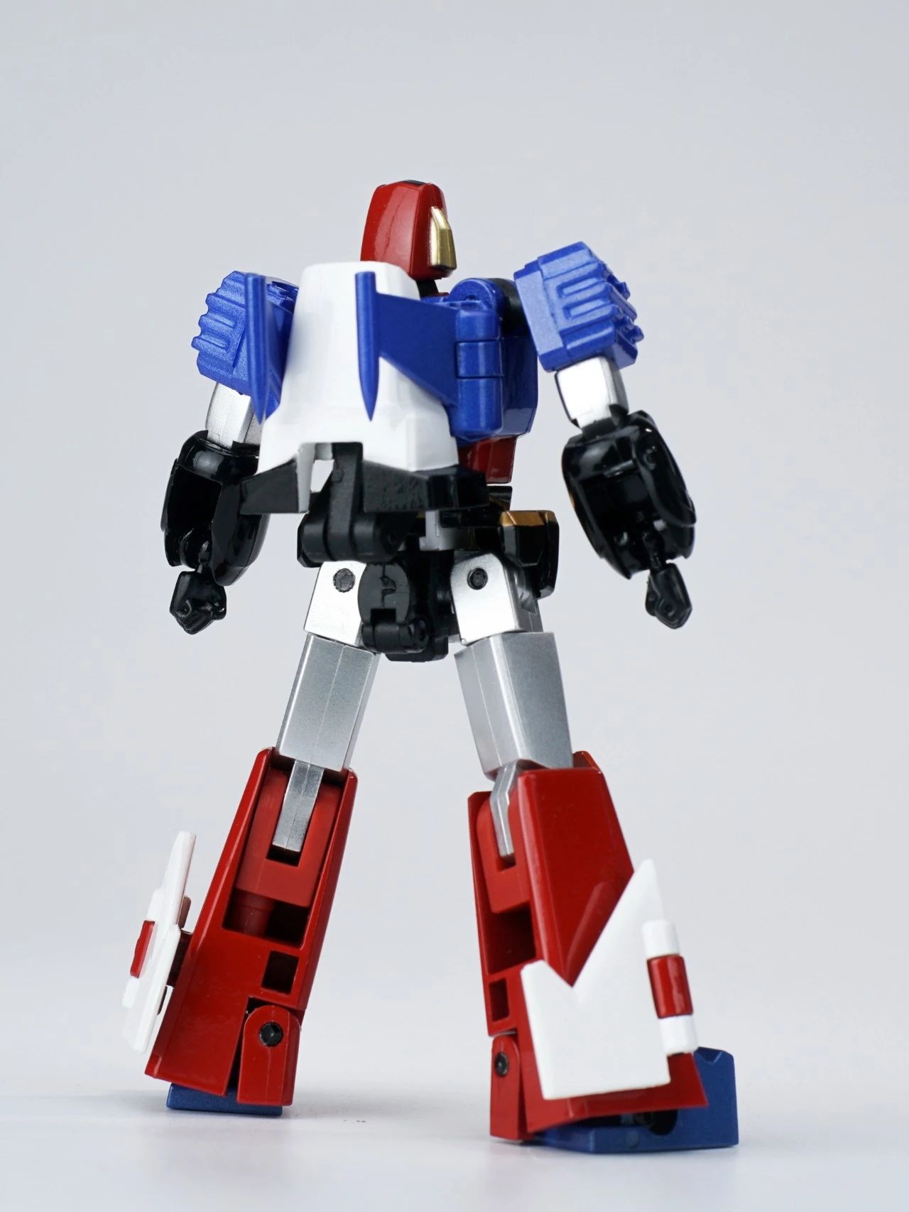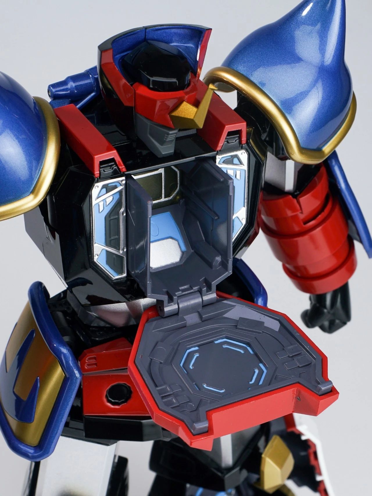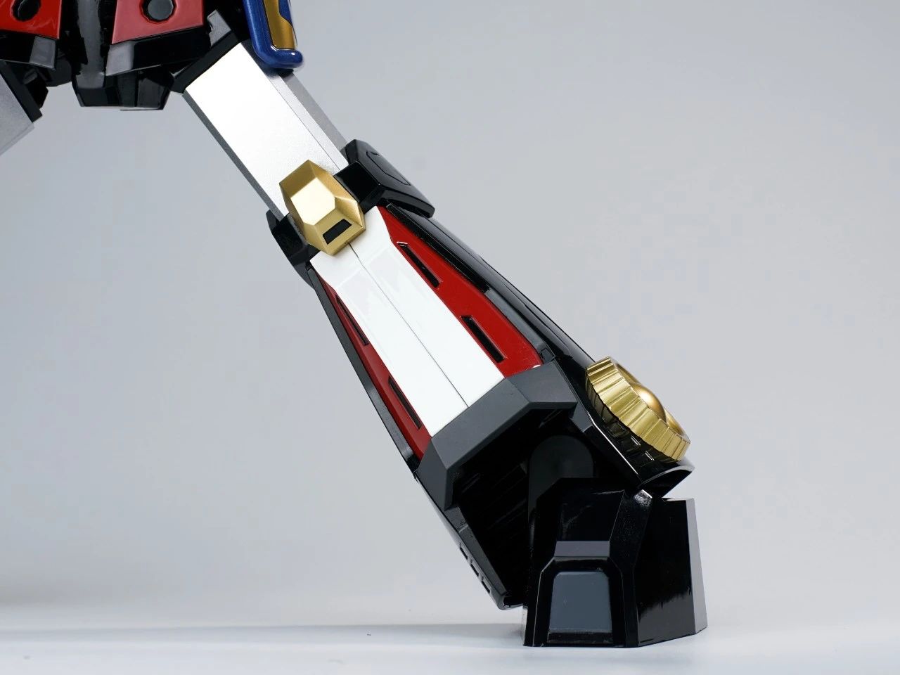 本体的躯干和双腿分别有针对收纳三台战斗机的专用收纳舱,内部细节还有分色涂装来呈现,个人认为这一款是非常适合摆出合体瞬间的状态。▼