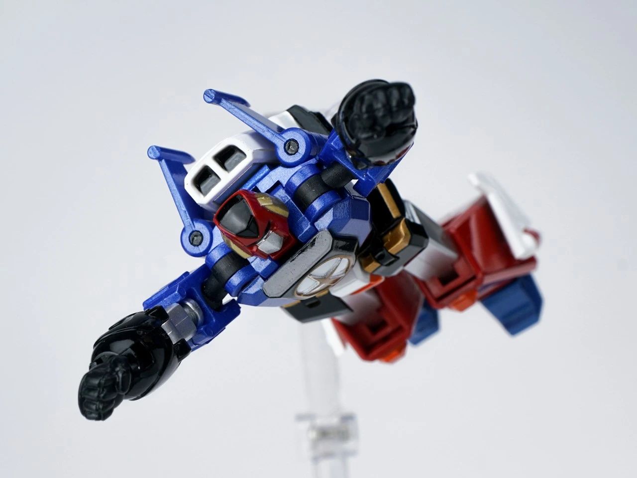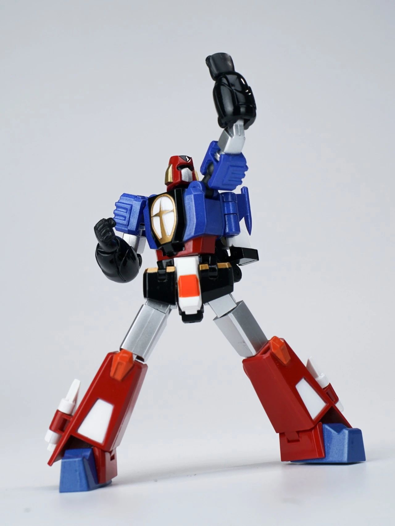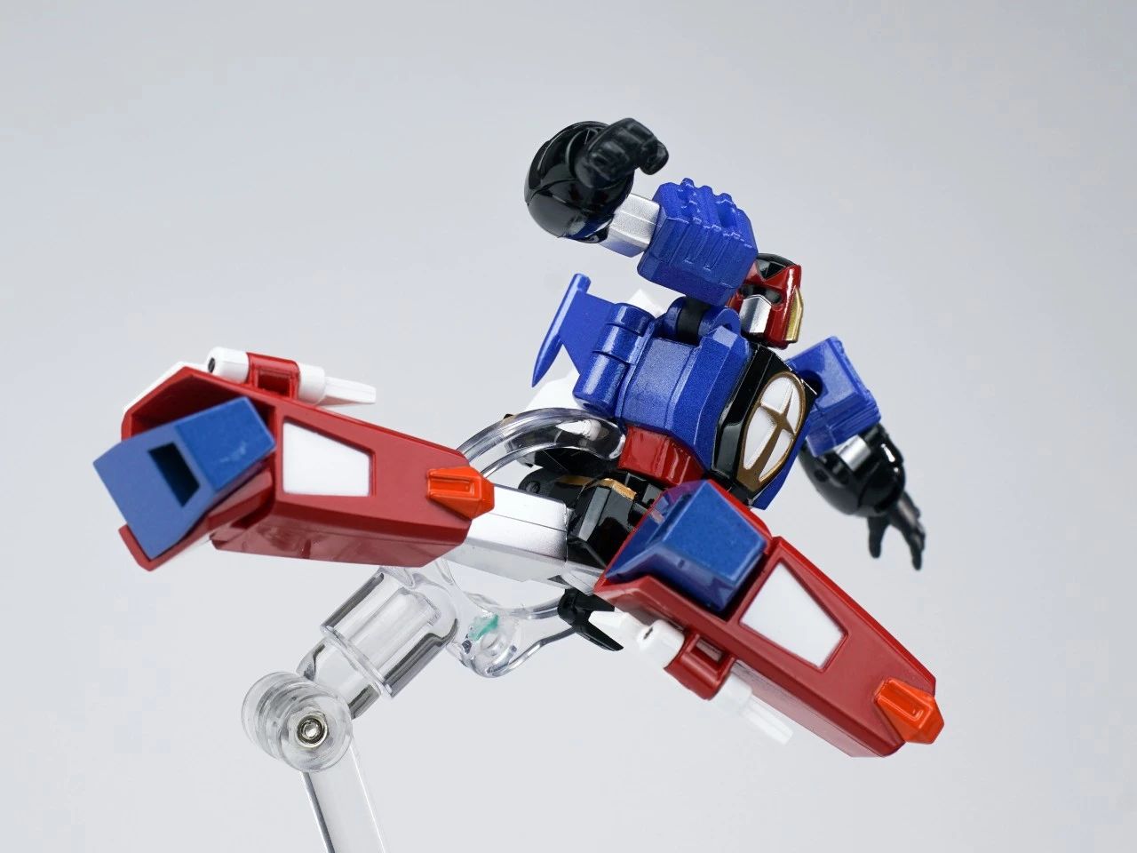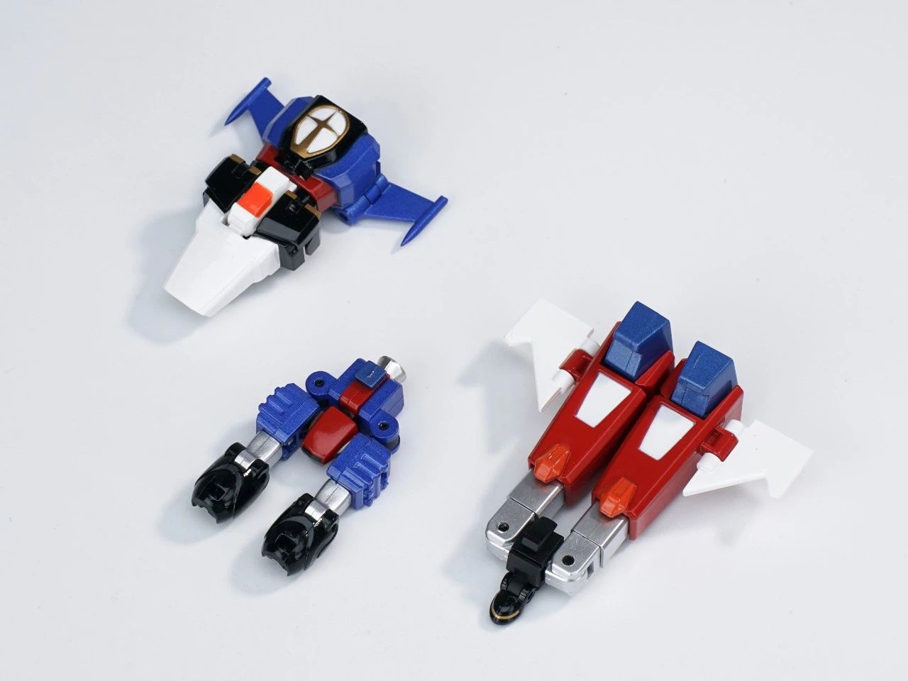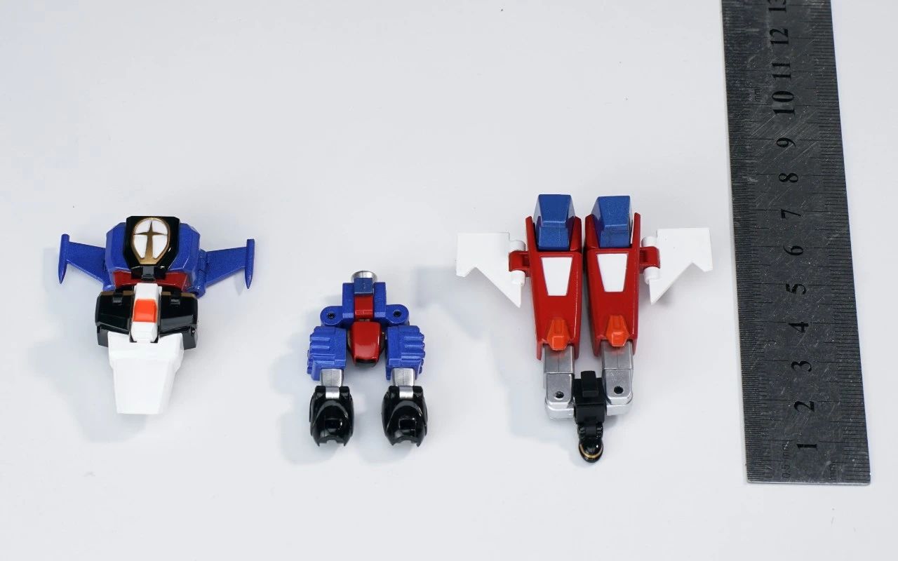 KING ARROW,JACK KNIGHT,QUEEN ROSE三架战斗机可分离、合体。机器人形态高度仅8cm左右,却具备了超高的可动范围,细节涂装也是十分到位,手臂方面有针对变形功能和合体造型两种可选择。▼