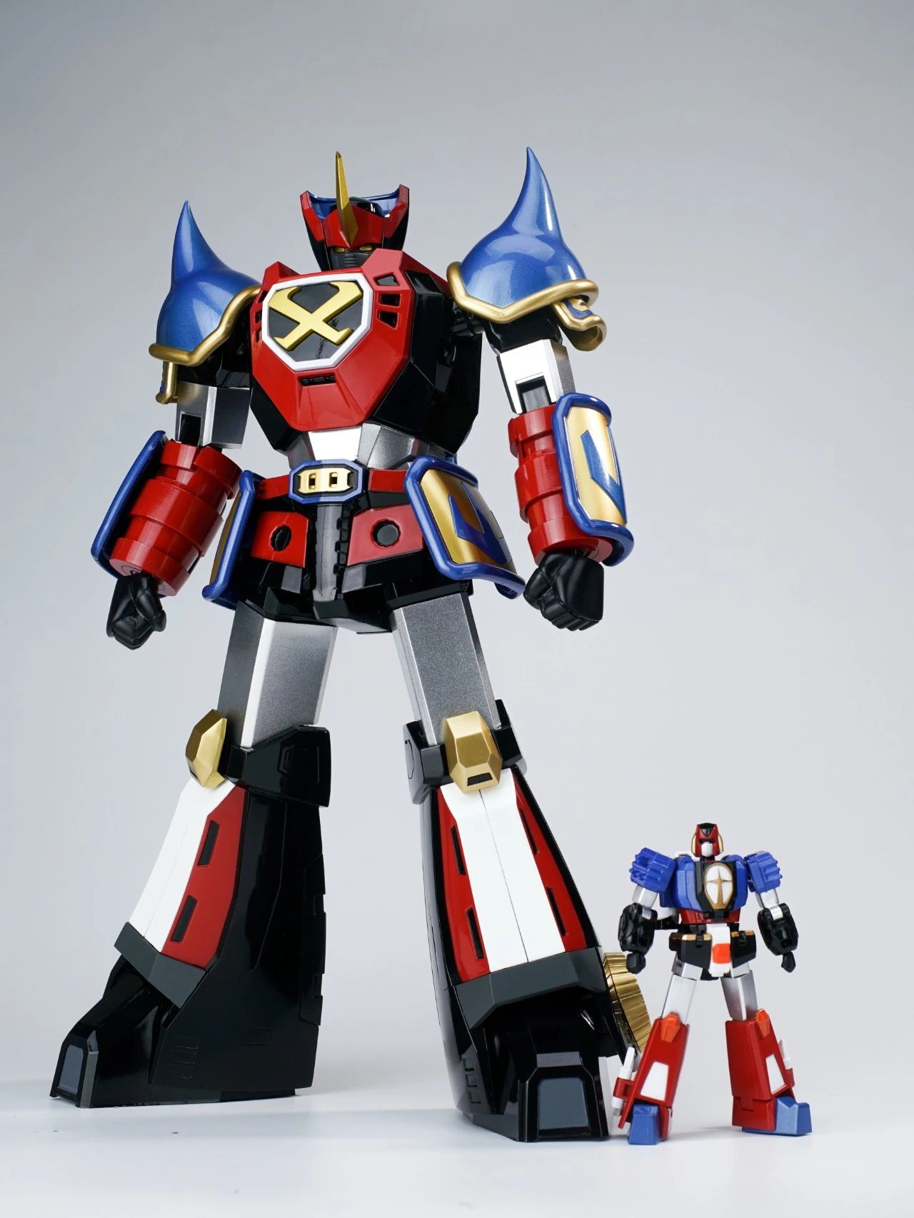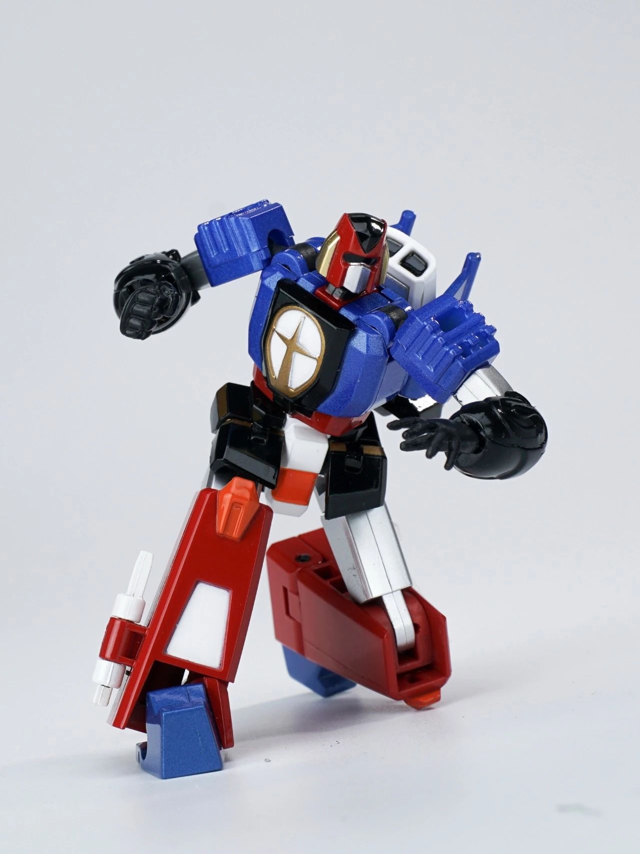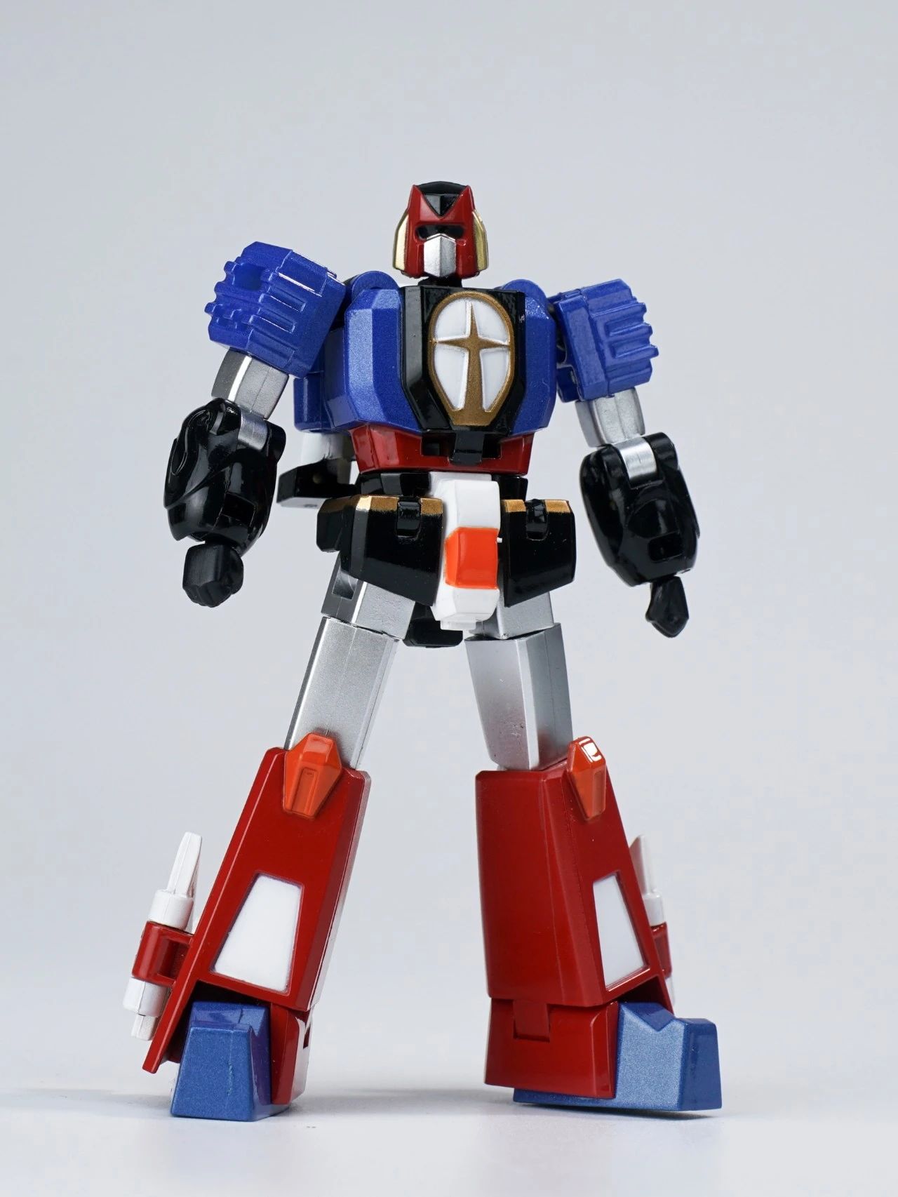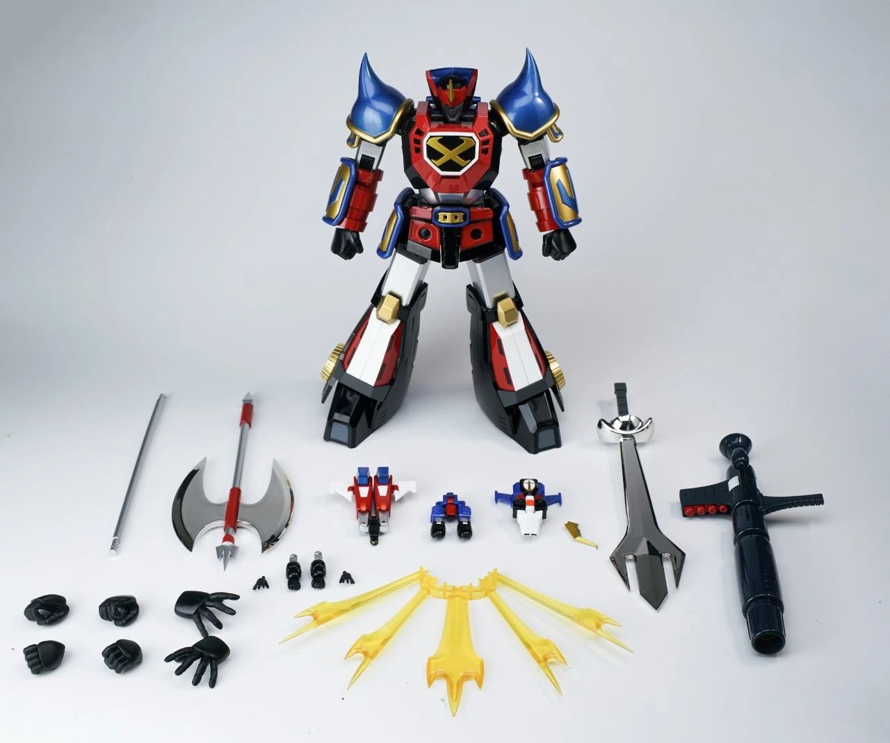 KING ARROW,JACK KNIGHT,QUEEN ROSE三架战斗机可分离、合体。机器人形态高度仅8cm左右,却具备了超高的可动范围,细节涂装也是十分到位,手臂方面有针对变形功能和合体造型两种可选择。▼