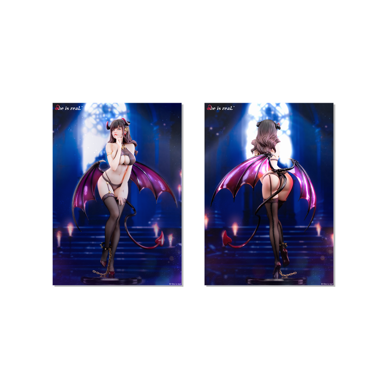 The She is real PVC figure - Nymph, is here with an extremely seductive pose and a graceful figure. The pink devil wings seem ready to flap, and the evil smile is captivating.